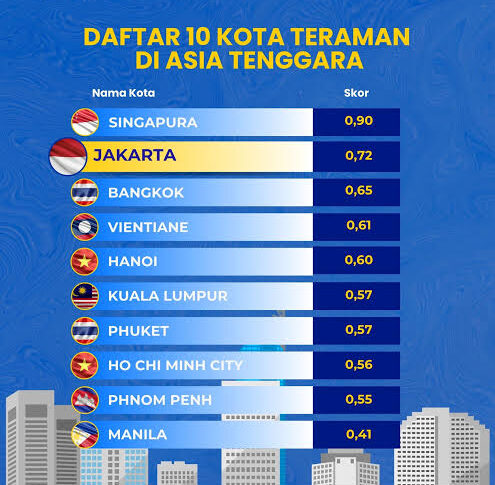 Ibu kota Indonesia itu meraih skor keamanan 0,72 dan hanya berada di bawah Singapura, sekaligus mengungguli Bangkok, Kuala Lumpur, Manila, Hanoi, hingga Vientiane.